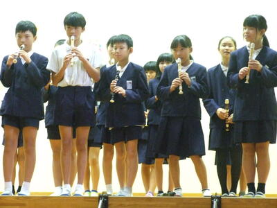 修学旅行で学んだ戦争や原爆の悲惨さ、平和の尊さ、仲間の大切さを劇にして発表しました。子どもたちが発するメッセージは、聴いている人の心に響いたと思います。美しいハーモニーの合唱は来週郡市音楽会で発表します。