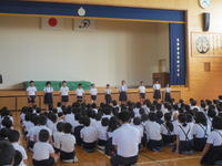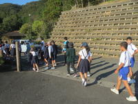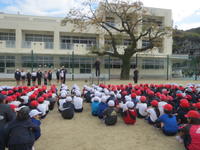 本校では、午後から各教室で事前指導をした後、体育館で災害に対する心構えや、学校で災害が起こった場合の避難の仕方や避難場所などについて話を聞きました。その後、「全校集会時に地震が起こり、津波が来る可能性がある」という想定で、全校で学校上の第2グラウンドに避難をしました。今回の訓練には、牛深中学校の生徒も参加し、第2グラウンド上の、第1駐車場では小中学生が一緒になって地区ごとに集まる練習もしました。高学年や中学生が、同じ地区の子どもたちに声をかける姿が見られました。