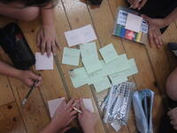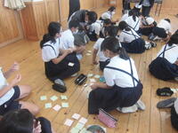 次に、多目的室でワークショップを行いました。4・5人でグループを作り、緑の付箋紙に「東京や京都などの都会にあって、天草にないもの」、ピンクの付箋紙に「東京や京都などの都会になくて、天草にあるもの」を書き出しました。緑の付箋紙には、テーマパークや飲食店、有名店などが多く書かれていました。ピンクの付箋紙には、魚や海などの自然界のもの、ハイヤ大橋や崎津集落などの観光地が多く書かれていました。まとめとして吉田准教授から、「自分の身の回りにある大切なものに気付いてほしい。そして、天草にしかないものを大切にしてほしい。」と話されました。