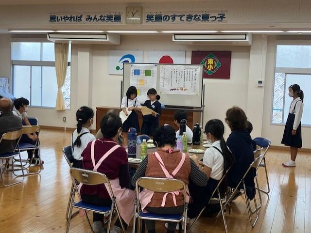 今日は4年生は収穫したサツマイモを地域の食生活改善推進員の皆様と蒸しパン作りに挑戦しました。また、調理した蒸しパンを「感謝の会」を通して、一緒に芋の植え付けから収穫までお世話になった地域の皆さんと美味しくいただくことが出来ました。