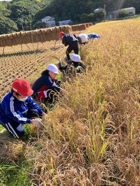 5年生は稲刈りの体験を 4年生は芋ほりの体験を地域の皆さんとさせていただきました。稲は5月に種撒きからはじめ、収穫までの一連を経験させていただきました。また、4年生も芋の苗植えから収穫まで経験でき、充実した体験を行うことが出来ました。秋晴れの中、子供たちの感性と笑顔が映えました。