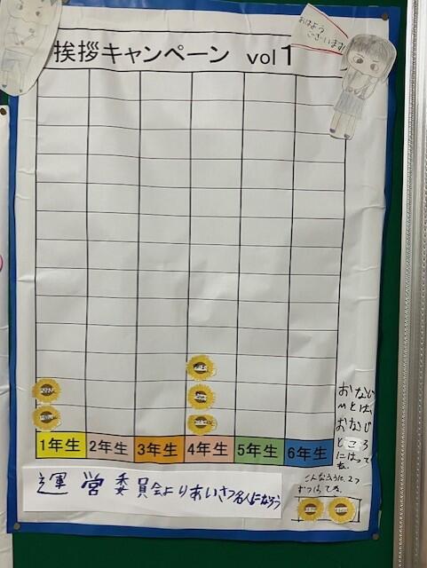 児童代表の運営委員会は6月からみんなのあいさつが元気に笑顔でできるようにするにはどうすればよいかな何回も集まって話し合いをしました。そして7月3日から始まったのが「あいさつキャンペーン」です。各学年のの挨拶名人を紹介していく取組ですが、さっそく誰かが紹介してくれていました。このグラフが挨拶名人でいっぱいになるといいね。