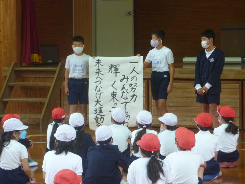 ゴールデンウイークが明け、元気に登校した東っ子たち。本日は2週間後の運動会に向けて集会を開きました。今年のスローガンは「一人の努力 みんなの協力 光り輝く東っ子~未来へつなげ大運動会~」です。運営員会のみなさんが熟議して決定したものです。運動会にかける熱い思いが伝わってきました。集会の後半は紅白に分かれての結団式を行いました。そっさくエール交換の練習が始まり、スタートからエンジン全開の東っ子たちでした。