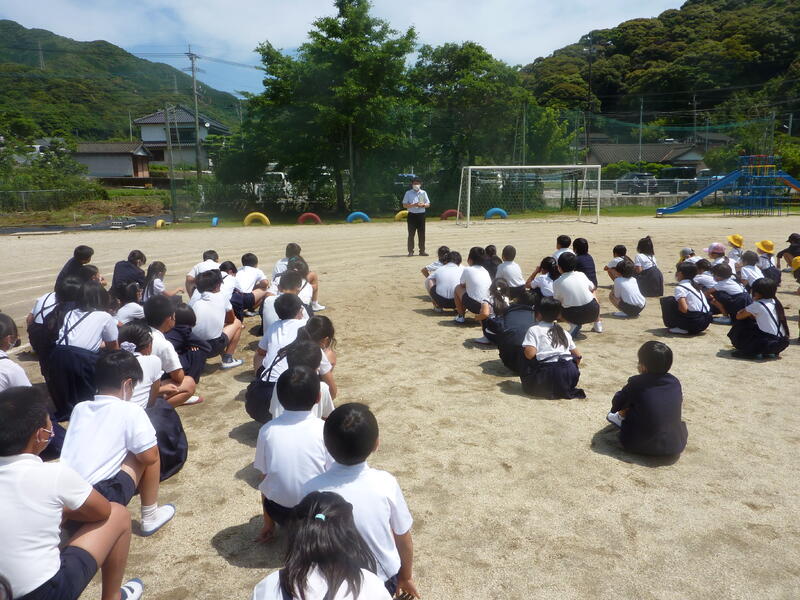昨日の雨空から晴天となった本日、避難訓練を実施しました。今回は「不審者対応・避難訓練」です。牛深警察署の方々にご来校いただき、不審者役と評価者で実際の対応を行いました。とても緊張感のある訓練で、命を守る意識が高まった時間でした。