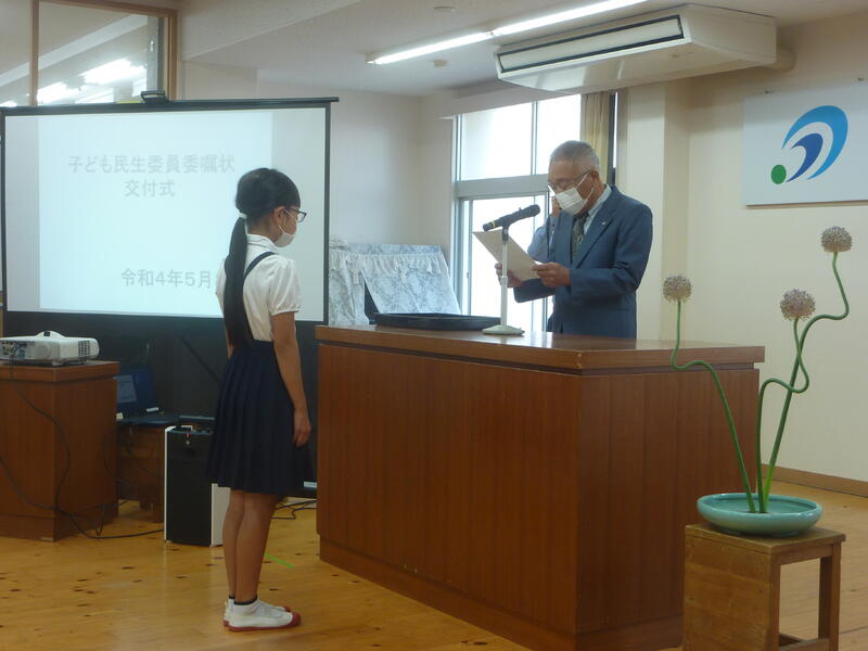 子ども民生委員への委嘱式が行われました。3年生22人が委嘱状を授与され、子ども民生委員となりました。地域の方々との交流を深め、福祉への関心を高めてくれることを願います。式の後半には、認知症サポート講座を受講し、高齢者の方々との接し方について学びました。