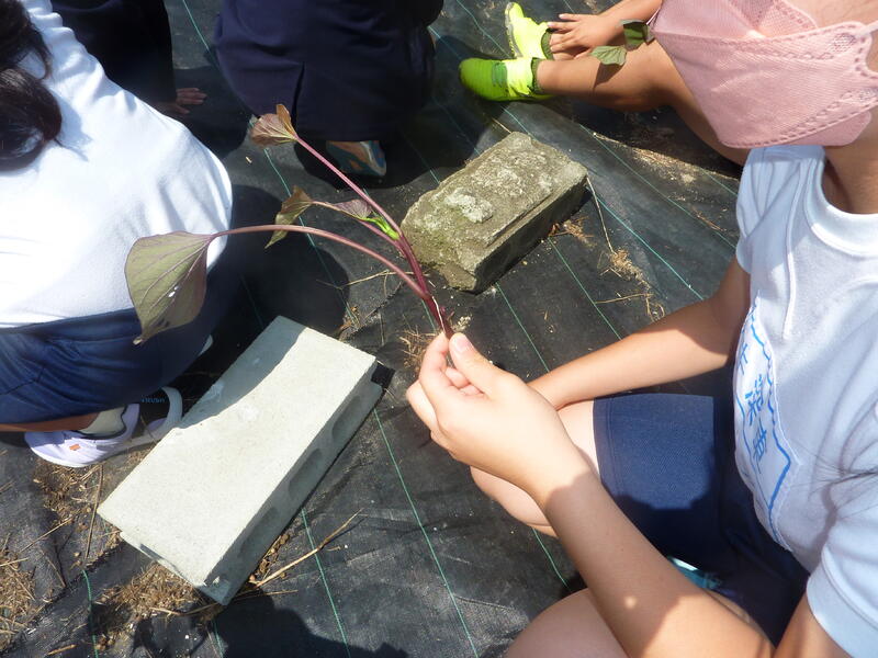6年生が芋の苗植えを行いました。地区振興会長さんのご厚意で、学校園を芋畑に開墾していただきました。昨年度の桜島大根の栽培体験を生かして、「紅あずま」の栽培活動にチャレンジです。秋の収穫が楽しみです。