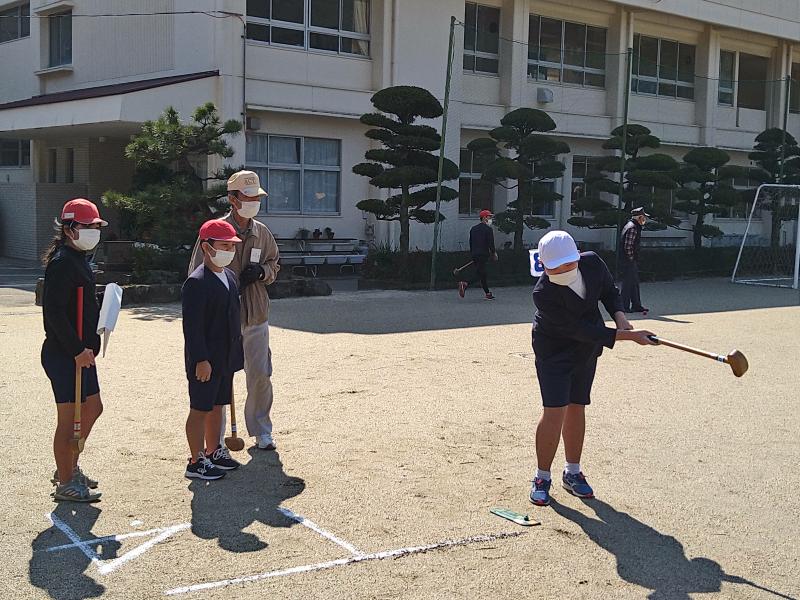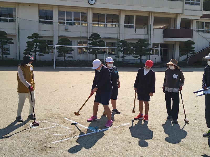 今日は、午後から快晴となりました。5.6校時を用いて、本年度初めての交流活動を行いました。地区振興会のご厚意で、グラウンドゴルフを通して、校区のみなさんと交流しました。6年生が、地域の先輩方のご指導を受けながら、プレーを楽しみました。本校の運動場が熱戦の会場になりました。