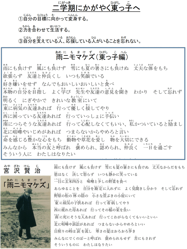 今日は放送集会で、各学年の代表の子どもたちが2学期の目標について発表しました。それぞれが1学期の成果と課題をもとに、今学期に目指す自分について、堂々と述べることができました。始業式で話した「変身」へのスイッチが入った東っ子だと感じました。