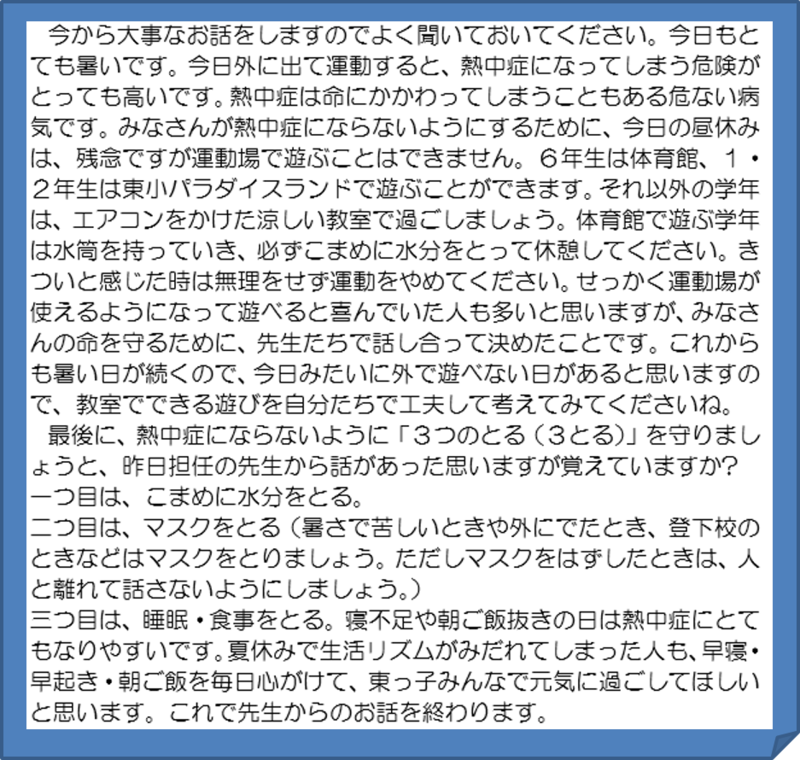 今日も高い気温の中での学校生活でした。朝から熱中症対応を話し合い、屋外での活動を中止しました。昼休みには、養護教諭から、子どもたちへ熱中症対策について放送による講話を行いました。