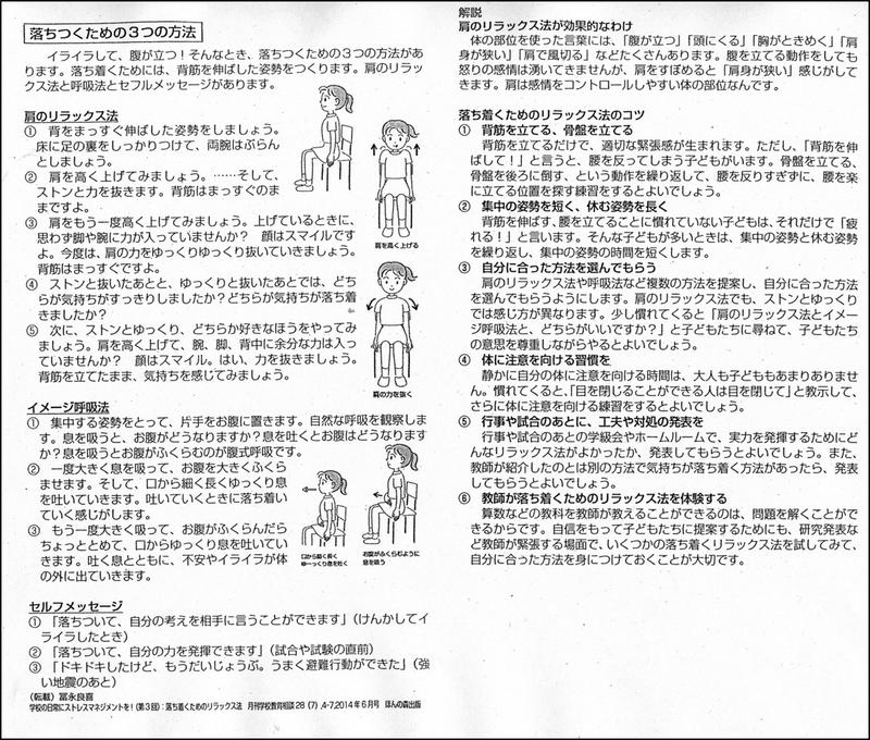 「セルフケア」という言葉があります。メンタルヘルスケアの1つで、心の健康づくりにおいて、「自分自身がストレスに気付き、これに対処するための知識・方法を身に付け、それを実施すること」と言われています。ストレスに気付くためには、ストレス要因に対するストレス反応や心の健康について理解するとともに、自分のストレスや心の健康状態について正しく認識できるようにしておくことが大切です。イライラしたり、何だから腹が立つなど、理由がはっきりしないのに、こんな状態になったときなど、自分を落ち着かせる方法をしっておくといいですね。よい資料がありましたので、貼付しておきます。参考にしてみてください。