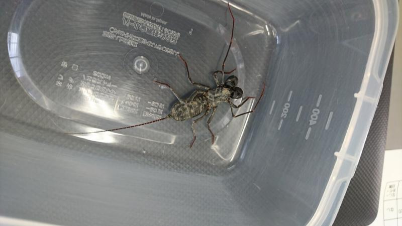 この奇妙な虫は、「サソリモドキ」といいます。今朝、森川先生が自宅で捕獲して学校にもってきてくれました。この「サソリモドキ」は、サソリの仲間でなく、実はクモの仲間です。体長約5cmほどの大きさで、石の下やがけにほった穴などをすみかにしています。サソリのような毒針はないのですが、刺激を受けると、お酢のようなニオイの毒ガス(毒霧)を出し、敵から身を守るそうです。かまれると、はれる場合もあるため、見かけた時は注意してください。牛深に生息するのは、「アマミサソリモドキ」という種類だそうです。牛深が北限といわれています。なんと熊本県の天然記念物に指定されており、「世界三大奇虫」の一つだともいわれているそうです。
