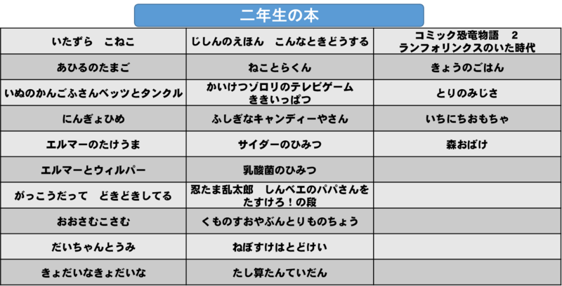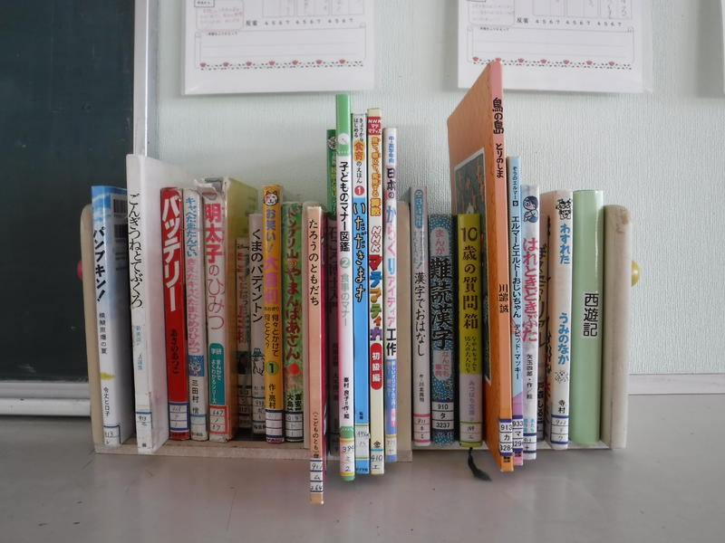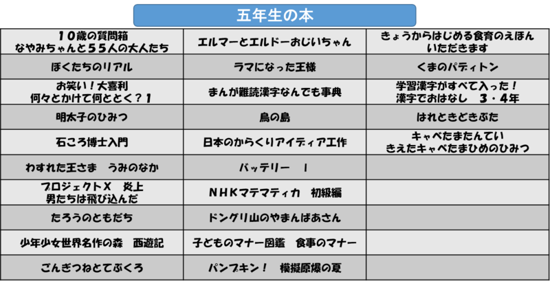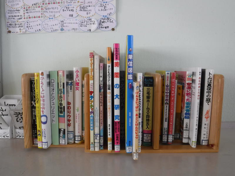 図書司書の橋本先生のセレクトで、学級に図書の配本がされています。貸し出しもできます。次の登校日には、借りてみてはどうでしょう。「一週間に一冊の読破(読み上げること)」チャレンジです。
