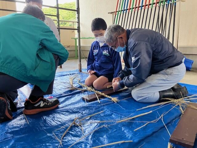 5年生の総合的な学習の時間の中で年間通して行ってきたお米作りの最後の活動として、収穫後の稲わらでしめ縄を作る体験をしました。地域でしめ縄づくりに取り組まれている皆さんにご協力いただき、それぞれお気に入りのしめ縄を完成させることができました。