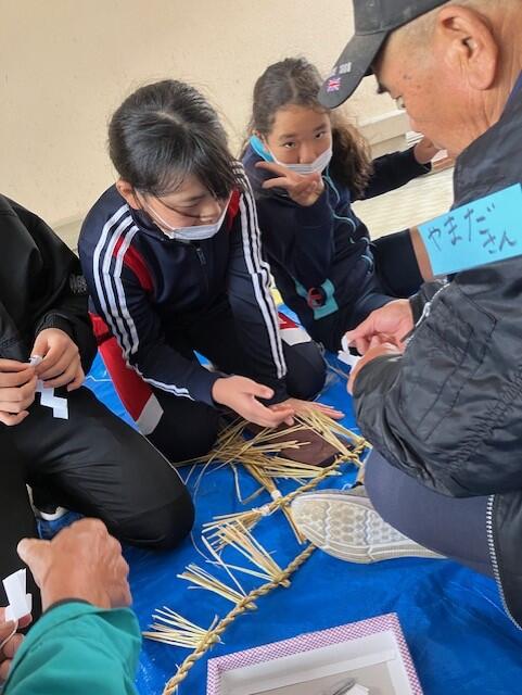 5年生の総合的な学習の時間の中で年間通して行ってきたお米作りの最後の活動として、収穫後の稲わらでしめ縄を作る体験をしました。地域でしめ縄づくりに取り組まれている皆さんにご協力いただき、それぞれお気に入りのしめ縄を完成させることができました。