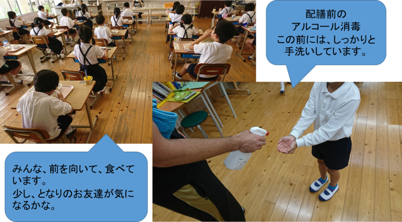 楽しい給食の時間ですが、感染症拡大防止の観点から、3密を避け、消毒の徹底の上で実施しています。子供たちも、十分な手洗い、そして、アルコールによる指間消毒を行った上で摂食しています。食べることに集中し、シーンとした中での給食時間です。給食の意義の一つである「会食」が体験できないことが残念ですが、給食を口にする子供たちの表情は笑顔でいっぱいです。