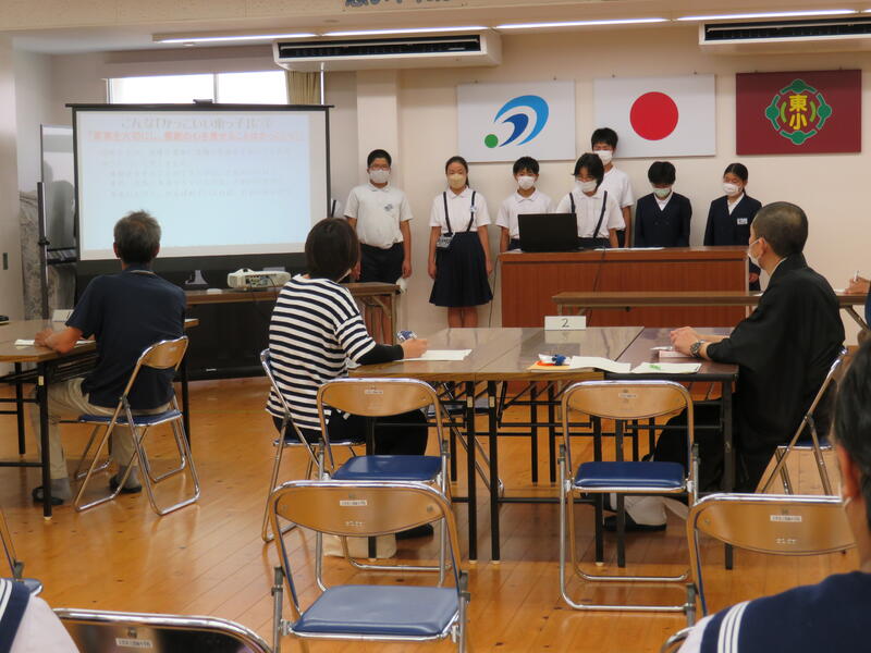 学校運営協議会を開催しました。15人の委員の皆様方に学校経営方針についてご意見を伺いました。本年度は東っ子6年生と東中の生徒会執行部のみなさんも参加し、それぞれが学校生活の様子や児童会・生徒会の取組を説明しました。5者が連携した学校づくりが深まった気がします。