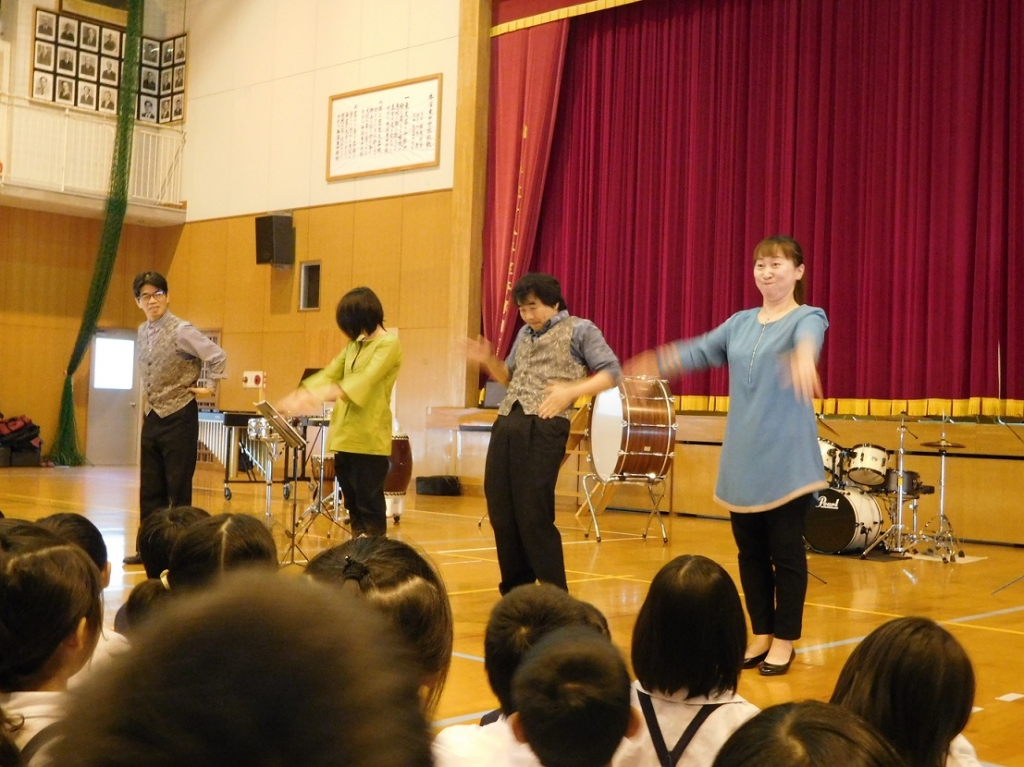 29日(月)に、牛深東中学校で「いきいき芸術体験教室」が開かれました。九州打楽器合奏団「花岡音楽堂」の方々による演奏が披露され、革や木、金属の楽器による様々な曲を聴くことができました。子どもたちが見たことのある楽器もたくさん出てきて、楽しく鑑賞することができました。今回の教室で表現や演奏の幅を広げ、もっと多くの音楽に親しんでほしいと思います。