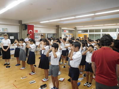 それぞれの学年の代表の子が、夏休みに楽しかった思い出と、自分の課題やがんばることを、作文を見ずに立派に発表しました。2学期は一番長い学期なので、たくさんの子の成長が見られることを期待しています。