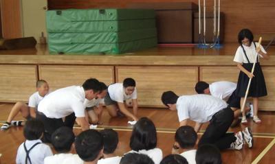 6年生児童による劇を行い、本校の掃除(無言掃除)について説明をしました。①掃除の意味②めあてをもつこと③いろいろなことに気づくこと④掃除後の反省をすることを中心に話をし、それらを黙って(落ち着いて)やるようお願いしました。