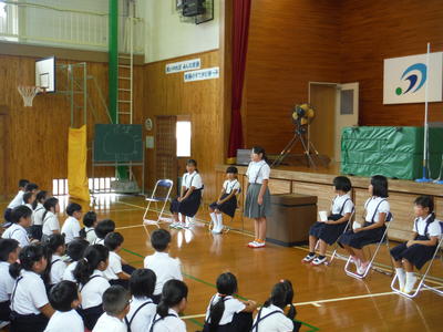 6日(金)の業間に「夏休みの思い出と2学期の目標」の代表発表がありました。