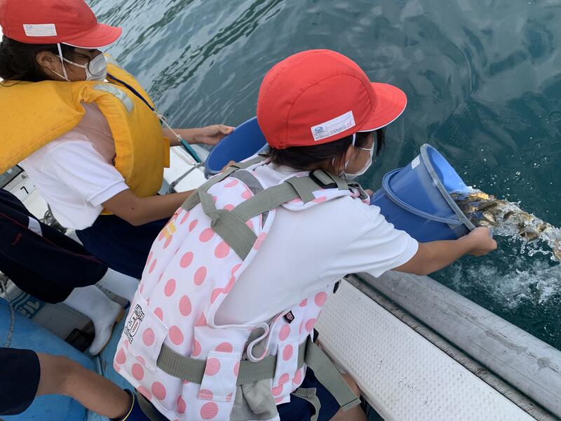 5年生が稚魚放流活動に参加しました。深海漁協様のご支援により、毎年、環境学習の一環として実施ています。