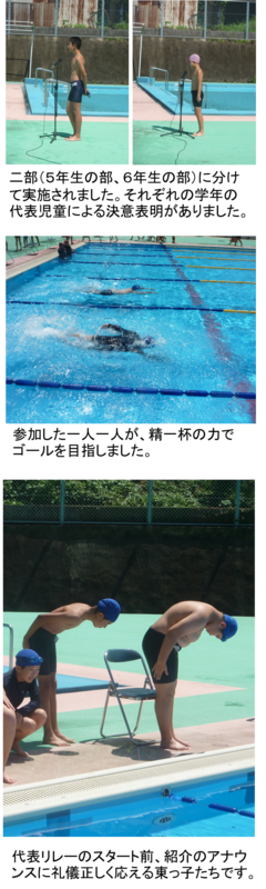 晴天の下、水泳記録会が実施され、5、6年生が参加しました。牛深小学校の子供たちと交流・親睦も目的の一つでしたが、感染症拡大防止のため、自己記録への挑戦がめあてになりました。コロナ禍にあり、また悪天候も重なり、十分な練習ができませんでしたが、参加した東っ子の泳ぎは抜群でした。一人一人が納得のいく記録をだしてくれたようです。猛暑の中、記録会を支えて頂いた役員の方々、美しく整えられたプールを提供いただいた牛深小学校に心より感謝します。