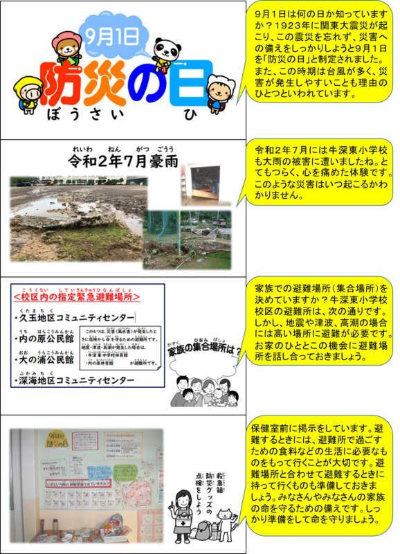 9月1日は防災の日です。台風11号の進路も気になりますが、令和2年7月豪雨で被災した本校は防災への意識を高く持ち、命を守る取組の日常化を図っています。今日は防災主任(養護教諭)から東っ子にむけて講話を行いました。学校で学ぶことを家庭生活で生かし、命の大切さを「わかり」「感じ」「行動」できる東っ子であることを願います。