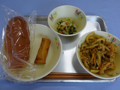 麦ご飯、肉しのだ、ゆず香あえ、かぼちゃのだご汁(606kcal)