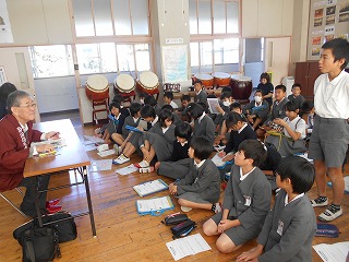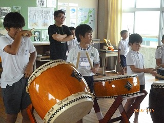 ・伝統文化教室で太鼓の練習をします。暑い教室から、熱い演奏が学校中に響き渡りました。
