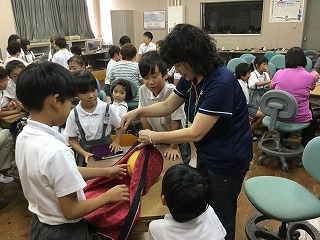 ・講師は、出町亀蛇保存会顧問の岡本武志さん、保護者の桑田さんでした。
