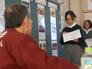 ・6年生は総合的な学習の時間、妙見祭について調べ学習をしました。一人一人まとめたものを、濵会長に見ていただき、意見をもらいました。