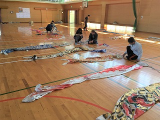 | ・もうすぐ5月の節句です。植柳小では、中庭に、こいのぼりをあげます。その準備をしました。 【体育館;こいのぼりの点検・補修】 ・教頭先生、教務や算数の先生、ALTのジョー先生など、家庭訪問に行かない先生で、こいのぼりの点検・補修をしました。 ★前々校長の村岡校長先生が、こいのぼり飾りを始められました。こいのぼりの寄贈を地域に呼びかけられ、たくさん集まりました。 ★今年で7年目になります。明日から見られます。ぜひ植柳小へ「こいのぼり」を見においでください。 |