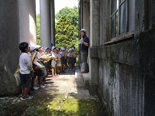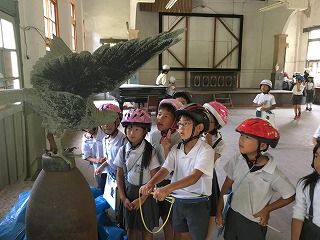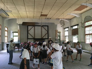 | ☆平成30年5月30日(水) 〇「植柳学」が始まりました(3年生) ・総合的な学習の時間、3年生は、植柳について学習します。主に、植柳小学校の歴史です。今日は、旧講堂について学びました。 【音楽室;「旧講堂」】 ・文化振興課の米崎さんに、旧講堂について話していただきました。 【旧講堂の中】 ・安全のため、ヘルメットを着用。子供たちは初めて中に入りました。 ・♪ポロロン、ときれいな音が鳴りました。盆踊り保存会の野﨑先生が、小学生のころ弾いたピアノだそうです。多くの卒業生が、このピアノの音色を聞いて、小学校生活を過ごしたのでしょうね。 【迫力ある鷲の置物】 ・「すごい!」と、子供たちが見入っていました。 【窓から見える朱橋】 ★次回の「植柳学」は、旧講堂で小学校時代を過ごした方々のお話を聞きます。どんな歴史、どんな思い出あるのでしょうね。とても楽しみです。 |