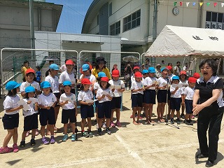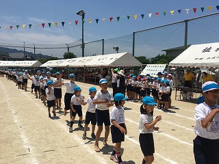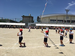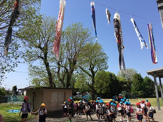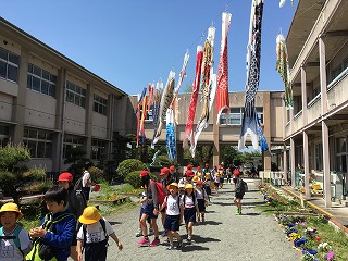 | ・お見知り集会を終え、運動場へ集合しました。 【児童玄関前のこいのぼり】 ・10時50分、運動所へ行きました。 【中庭のこいのぼり】 ・青空の中、こいのぼりが気持ちよさそうです。子供たちは笑顔です。 |