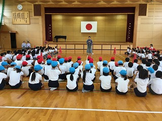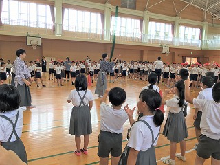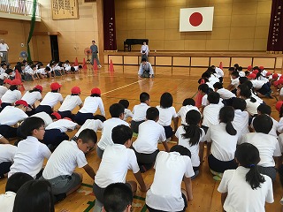 | ☆平成30年7月2日(月) ・文化庁主催の「文化芸術による子供の育成事業」があります。その巡回講演(芸術鑑賞会)が9月3日に行われる予定で、事前の体験型講習(ワークショップ)がありました。 【体育館;3~6年生が参加】 ・「万作の会」から3名の狂言師が来校され、狂言について学びました。 ・狂言は、今から600年ほど前、室町時代に成立した、日本の伝統芸能です。ユネスコの世界無形文化遺産にも登録されています。 【狂言「蝸牛」】 ・山伏と太郎冠者のやりとりがおもしろくて、子供たちが大笑いしていました。 【狂言をやってみよう】 ・音響や映像のない昔は、声と体ですべてを表現しました。子供たちは「柿を食べる」演技をやってみました。 【修行をしました】 ・「よろしくお願いします!」と礼をして、狂言の修行を3つしました。①言葉の稽古、②動きの稽古、③言葉と動きを合体させた稽古です。 【特別の修行もしました】 ・師匠に「大笑い」を教えてもらいました。子供たちは弟子です。 【大笑いをする弟子たち】 ・「わー、はっはっはっはっはっはっ!」と、大きな口を開けて笑いました。 【修行終了の礼】 ・礼をして感謝の気持ちを伝え、師匠と弟子の関係も終わりました。ありがとうございました。 ☆3名の狂言師の方から、日本の伝統芸能である「狂言」の楽しさを教えていただきました。 ☆芸術鑑賞会まであと2ヶ月あります。時々練習して、忘れないようにしようと思います。 ☆本番がとても楽しみになりました。「万作の会」の皆様、ありがとうございました。 |