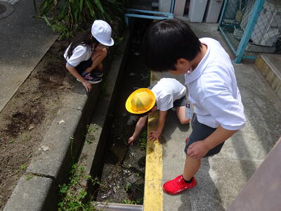 週明けのこの日、低学年の子供たちが側溝をのぞき込んでいました。