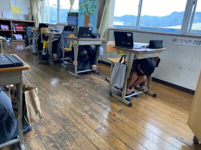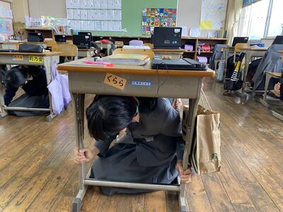 すばやく姿勢を低くし、机の下に隠れる子どもたち。