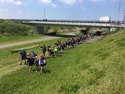 6年生と1年生のペアから、麦島東公園へ向けて出発しました。