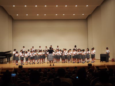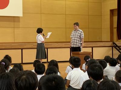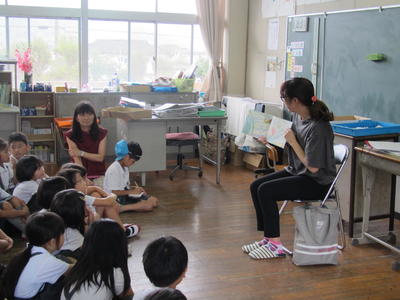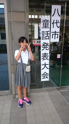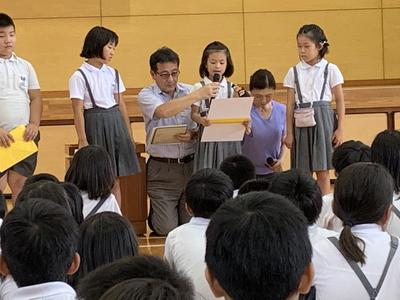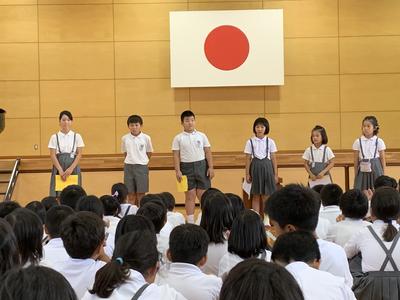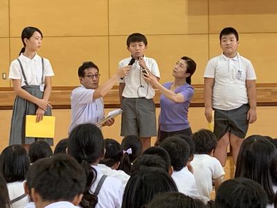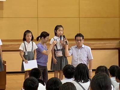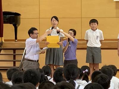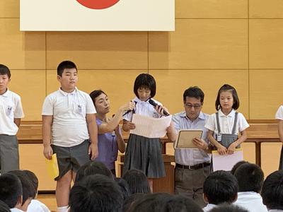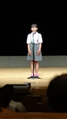 植柳小学校の1年生2人が作文の発表、4年生の代表の子が童話発表をしました。