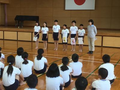 | ☆平成30年12月14日金曜日 〇児童集会がありました ・12月の児童集会がありました。 【体育委員会の発表①】 ・12月10日から始まったジョギングタイムについて、気を付けることを寸劇で発表しました。 ①鬼ごっこをしない。 ②逆走しない。 ③急に止まらない。 【体育委員会の発表②】 ・体育館の中は寒いので、みんなで「くまモン体操」を踊って温まりました。 【広報委員会の発表】 ・1月16日~18日の3日間を「いずかっちクイズチャレンジ週間」として、クイズを通して植柳や八代、日本の文化を学びます。その告知をしました。 【運営委員会の発表】 ・代表委員会で決まったことを発表しました。 ・12月17日(月)昼休み 〇晴れたら、運動場で氷鬼 ●雨だったら、体育館で「クイズこの声はだれでしょう?」 【感想発表】 ・12月8日(土)八代厚生会館で行われた「子ども人権集会フェスティバルinやつしろ」に参加した児童が感想を発表しました。 ◆5年平松君◆「とら太の会の人たちが、障害のあるなしに関わらず、一生懸命がんばって発表していました。」 ◆6年宮嶋君◆「日奈久中の『エルコスの祈り』を観て、一人一人が個性を出すこと、お互いに認め合うことが大切だと思いました。いじめや差別もなくなると思います。皆さんも来年は参加してみませんか。」 ☆★表彰★☆ おめでとうございます!! 【読書感想画の表彰】 【子どもの美術展の表彰】 【11月の生活目標の表彰】 ・5年1組と6年1組が表彰されました。 【みんなで今月の歌】 ・最後に全校で12月の歌「♪スマイルアゲイン」を歌いました。 |