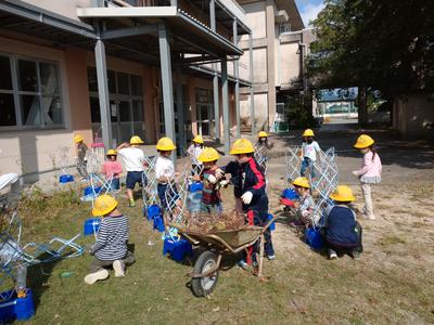 放課後、職員で運動会に向けて、運動場の草引きや事前に刈っていた草を集める作業をしました。