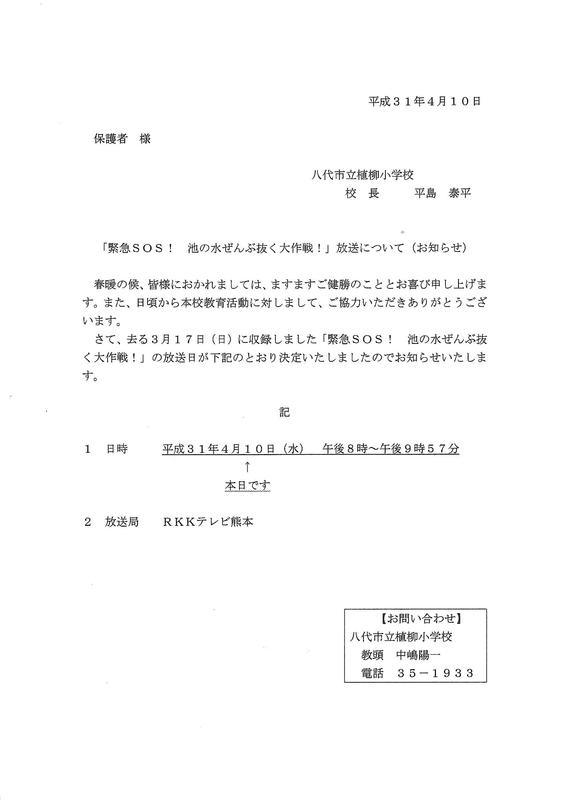 ★本日(4月10日)午後8時から、RKKテレビ熊本で放送される番組で植柳小学校が登場します。是非ご覧ください。→「緊急SOS!池の水ぜんぶ抜く大作戦!放送について」.PDF