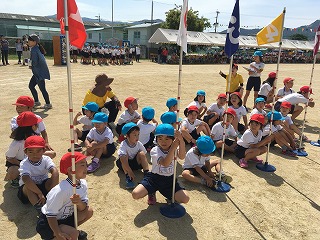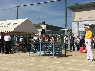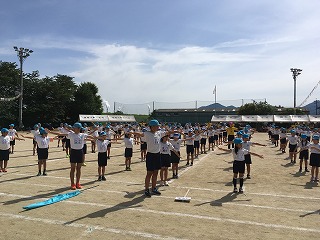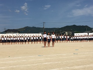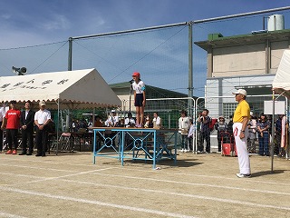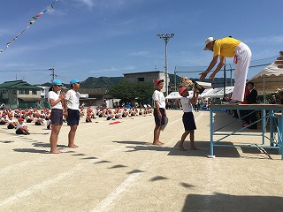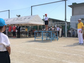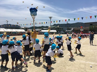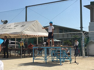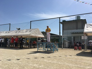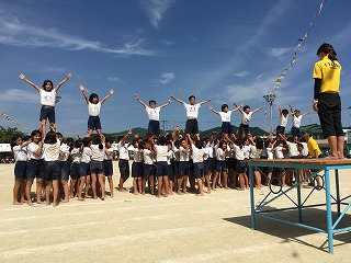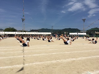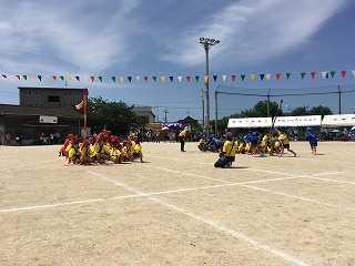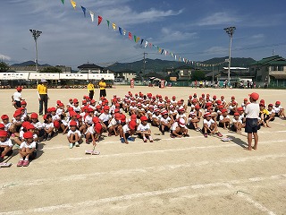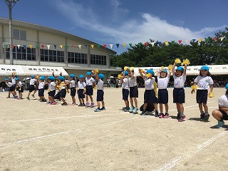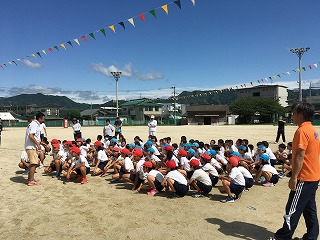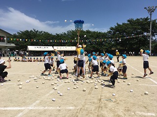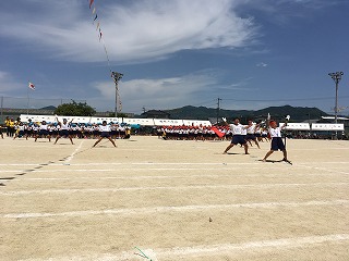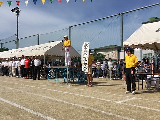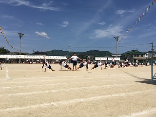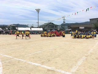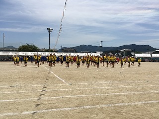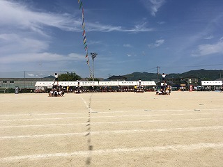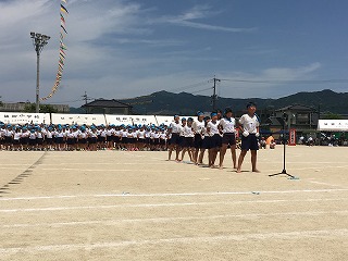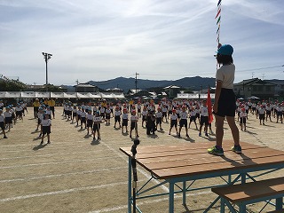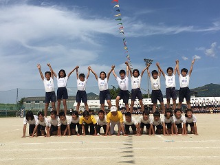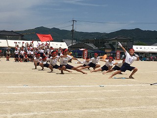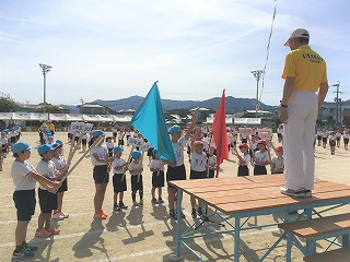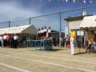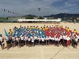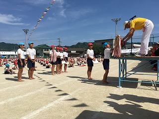 | ☆平成30年5月28日(月) 〇最高の運動会でした⑤ ・運動会午後の部の続きです。 ★閉会式★ 【成績発表】 ・青団795点、赤団861点で、6年ぶりに赤団が優勝しました。 【表彰;運動会】 ・赤団団長岩本さんがトロフィーを、副団長桑田さんが賞状をもらいました。 【表彰;町内対抗リレー】 ・男子 優勝下1、②上1、③元町 女子 優勝下1、②下2、3上1 【講評;久保校長先生】 【校歌斉唱】 ・指揮は、放送委員会の6年森さん。 【万歳三唱;PTA副会長の西郡さん】 【閉会の言葉】 ・運営委員会6年の松永さん ・予定通り午後3時30分に、運動会を終了しました。 ★解団式★ 【青団団長のあいさつ】 【赤団団長のあいさつ】 【全校児童で記念写真】 ★3週間、運動会の練習を頑張ってきました。その成果を、十分発揮できました。 ★全校児童268名、力を合わせて、最高の運動会ができました! |