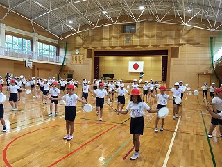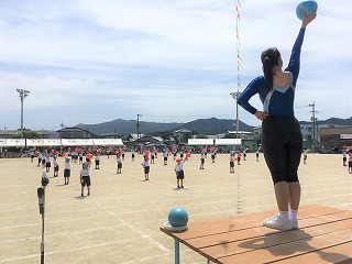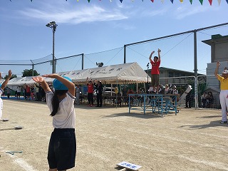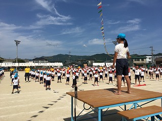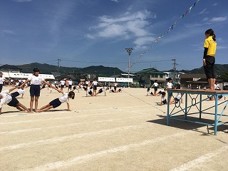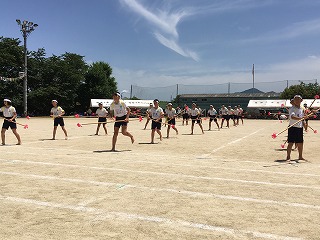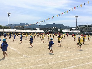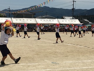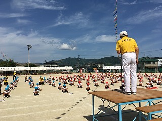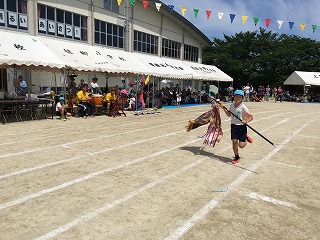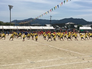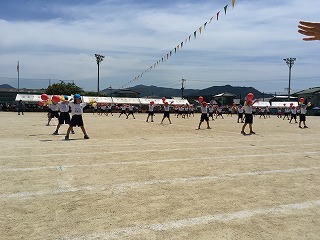 | ☆平成30年5月28日(月) 〇最高の運動会でした③ ・運動会午前の部の続きです。 プログラム⑨ ・「島唄」の曲にあわせて踊りました。 プログラム⑩ 【中学年;いずかしハリケーン】 ・竹の棒を4人で持って、リレーをしました。赤団の勝利でした。 プログラム⑪ 【6年生選抜;第58回桑田杯レース】 ・15名の代表児童が1500m走に出場しました。 【桑田杯レース;ウイニングラン】 ・6年生の吉田さんが優勝でした。 プログラム⑫ 【低学年;OH!GAME】 ・ボールを使ったエアロビダンスを踊りました。外部指導者の園田先生も指令台の上で踊ってくださいました。 プログラム⑬ 【低学年;紅白玉入れ】 ・青団が勝ちました。 プログラム⑭ 【高学年;植柳棒踊り】 プログラム⑮ 【全校親子ダンス;植柳の盆踊】 ・たくさんの保護者、地域の方に参加していただき、盛大に踊りました。 【指導者の野﨑先生】 ・40年間続いている伝統芸能の「植柳の盆踊」。熊日新聞やNHKの取材がありました。 |