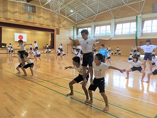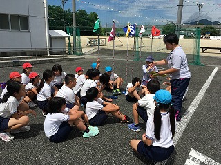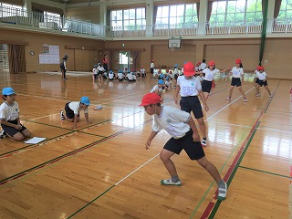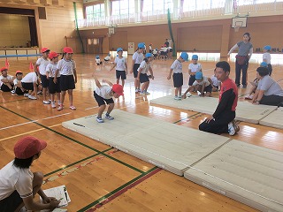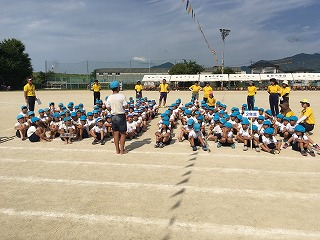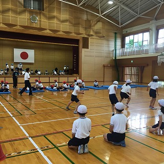 | ☆平成30年7月11日(水) ・2時間目、運動場で「こま回し体験学習」がありました。総合的な学習の時間に、日本の伝統的な遊びをしました。 【桜の木の下であいさつ】 ・30度を超える暑さでした。木陰で、会を始めました。16名の地域サポーターの方々が、こま回しを教えてくださいました。 【サポーター先生に教えてもらう子どもたち】 ・まずは、ひものかけ方から教えてもらいました。みんな真剣に習っています。 【回るこまに歓声!】 ・さすが、サポーターの先生。上手にこまを回されました。すごくて拍手!! 【こま回し体験】 ・みんな暑さも忘れて夢中にこま回しをしました。 【回るかな?えいっ!】 【丁寧に教えてもらいました】 ・1班は子どもたち4人で、1人の先生がついてくださいました。親切丁寧に教えていただき、「初めてできた!」と、喜ぶ子どもがたくさんでした。 【こま回し体験学習;終了】 ・30度を超える猛暑の中、こま回しを教えてくださり、ありがとうございました。 〇今年も水泳指導をお願いします(5、3年生) ・校長先生は体育指導が専門で、今年も水泳指導の補助をしてもらっています。 【5年生;平泳ぎの指導①】 ・手の掻き方を教えてもらいました。 【5年生;平泳ぎの指導②】 ・校長先生の周りに集まって、教えてもらいました。 【3年生;平泳ぎの指導】 ・平泳ぎの足の動きを指導してもらいました。子どもたちは、プールサイドに手を置き、練習しました。 〇特別な教科「道徳」の研修会がありました ・県教育センターより、安武指導主事を講師としてお招きし、「道徳における指導方法の工夫と改善」について研修を行いました。 【パソコン室;第15回校内研修】 【安武指導主事の講話】 |