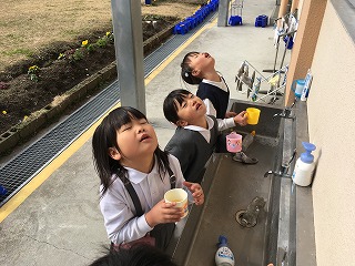 | ☆平成30年1月21日(日) ・保健委員会の取組で、毎年「お茶うがい」をしています。 【お茶うがいをする1年生】 ・2時間目の休み時間、全校で取り組んでします。 【家庭科室;お茶を手渡す保健委員】 ・学校放送で呼びかけ、全学級にやかんを渡します。朝から準備をして、2時間目後に渡し、昼休みに片付けます。6年生が週に3回、5年生が週に2回担当します。ありがとうございます。 【お茶をつぐ1年生】 ・歯磨きで使うコップに、先生と一緒にお茶をつぎます。 ★1月に入り、インフルエンザ罹患者は合計8名です。県内でインフルエンザが流行していますが、植柳小でもしっかりと予防していきたいと思います。 |