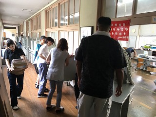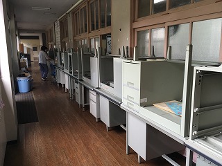 | ☆8月29日(火) ○棚や机を職員室へ運び入れました ・職員室の床改修が終わり、机や棚を入れました。 【きれいになった床】 ・床板は檜です。机や棚を入れる前の職員室。 【午前中は職員作業】 ・机や棚を出すのは40分と早かったのですが、入れるのは2時間半ほどかかりました。 【机の配置決め】 ・今回の引っ越しを機に、机の配置を新しく変更しました。配置決めに時間がかかりました。 【New職員室が完成!】 ・机の配置が一部変更になり、プリンターや湯茶コーナーが職員室後方へ移動しました。 【廊下もすっきり】 【職員室への運び入れ完了】 ・床がきれいな新しい職員室になりました。 ★明日は、業者さんによるLANケーブルやパソコンの設置があります。その後、職員でパソコン室の道具類をすべて運び入れ、すべての引っ越しが完了です。 |