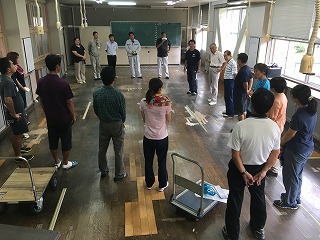 | ☆7月30日(日) ○職員室の床改修工事があってます ・床板が4分の1ほどはがされました(7月28日金曜日撮影) 【更衣室側の板】 【少しずつ床改修が進んでいます】 |