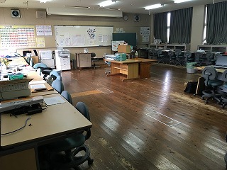 | ☆8月22日(火) ○職員室の床改修工事が終わりました 【床板がきれいになりました】 【職員室横に置いている机など】 ・8月29日(火)が職員室への引っ越しです。 ・机や棚などを運び入れます。それまではパソコン室が仮の職員室です。ご用の方はパソコン室まで。 |