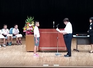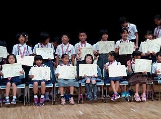 | ☆7月27日(木) ○最優秀賞!おめでとう! ・7月25日(火)ハーモニーホールで「第12回八代市童話発表会がありました。 【表彰式の様子】 ・1年生から6年生まで各小学校の代表27名が発表。その中で、植柳小6年平松くんが最優秀賞に選ばれました。おめでとう! 【童話発表会出場者;後列中央が平松くん】 ・「ちゃっくりがきいふ」を発表。講評『会場全体をお話しの世界に引き込むような素晴らしい表現力でした!』 ・八代市代表として、10月の県大会に出場します。 ○校内研修がありました ・7月26日(水)14:30~16:30まで校内研修でした。指導案についての話し合い、嘔吐対応の実技研をしました。 【嘔吐対応の実技】 ・嘔吐物処理セットに薬品やマスクなど入れてあり、マニュアルにそって処理しました。 |